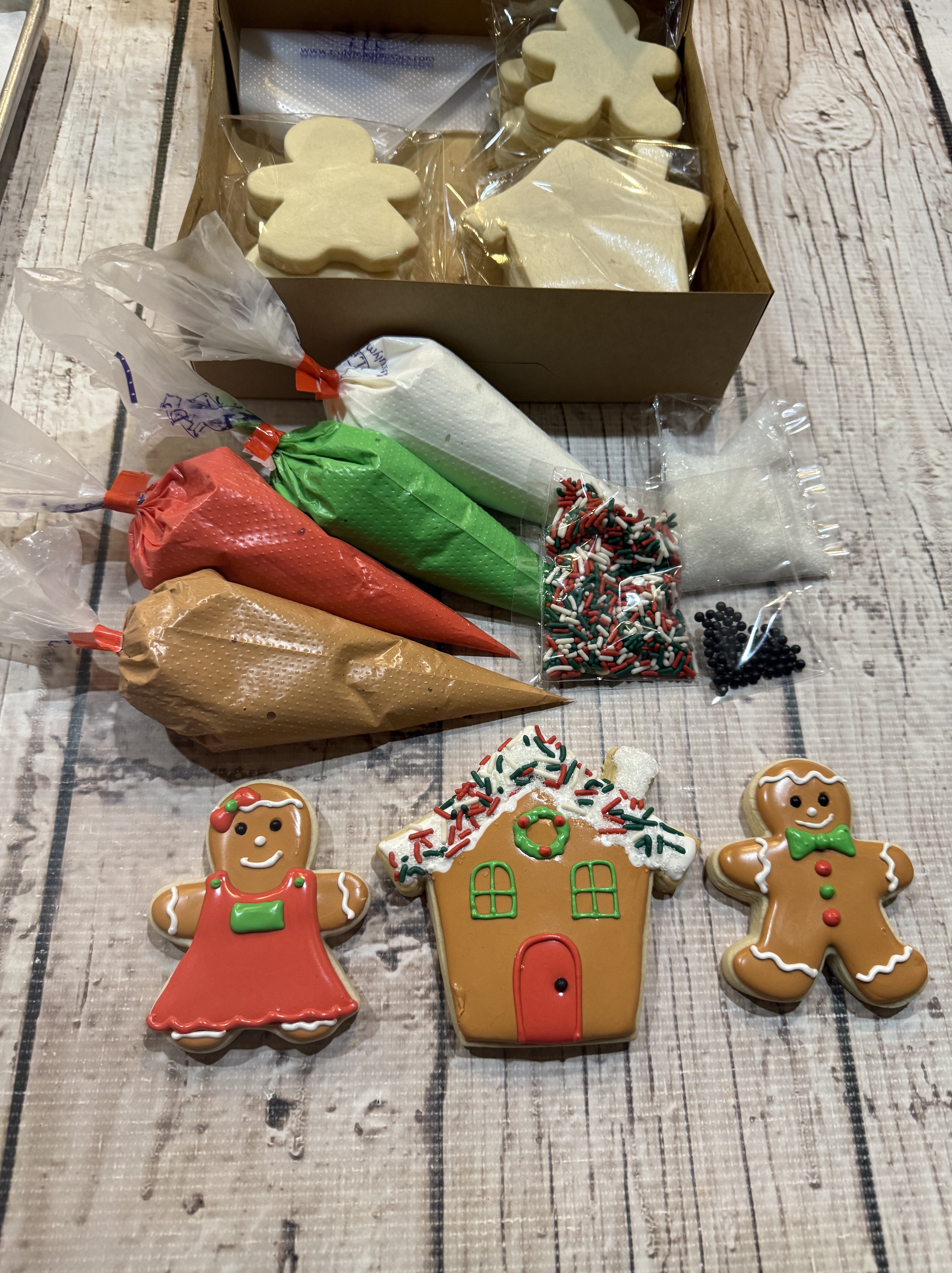 Comes with 12 sugar cookies, 3 sprinkles, (4) wooden picks, (4) bags of colored icing, (3) extra icing bags and instructions.