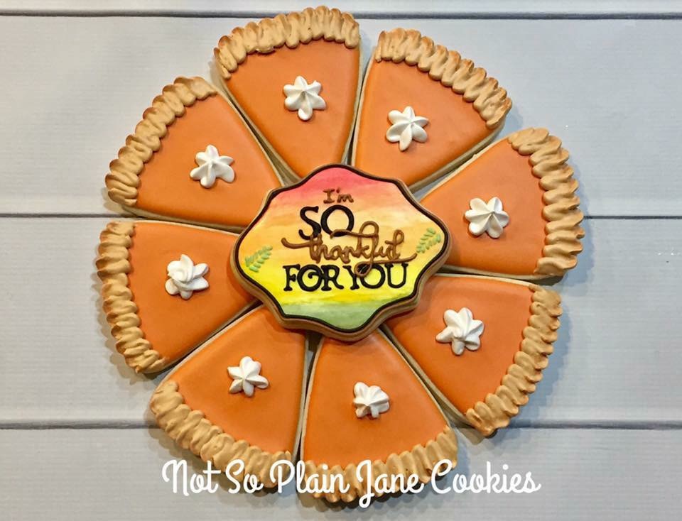 Pumpkin Pie Cookie Platter – comes with (9) 3.5″ cookies and. 4″ plaque cookie center. Comes in our signature Almond or (NEW for FALL) Pumpkin Spice Flavor. (indicate in comment which flavor you prefer).