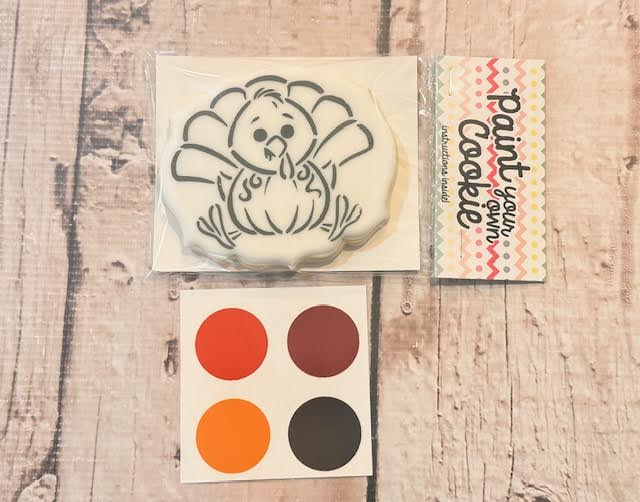 PYO – Paint Your Own Turkey Cookie comes with a large cookie with an outlined turkey, edible paint palette,brush and instructions. You simply wet the brush to activate the paint palette and then paint your cookie.