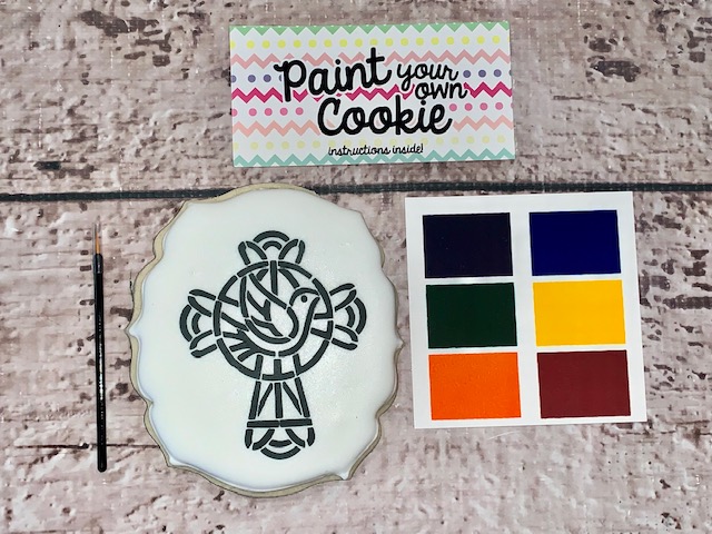 Paint Your Own Cookie – Cross with Dove comes with a cookie, edible paint palette, mini brush and instructions.