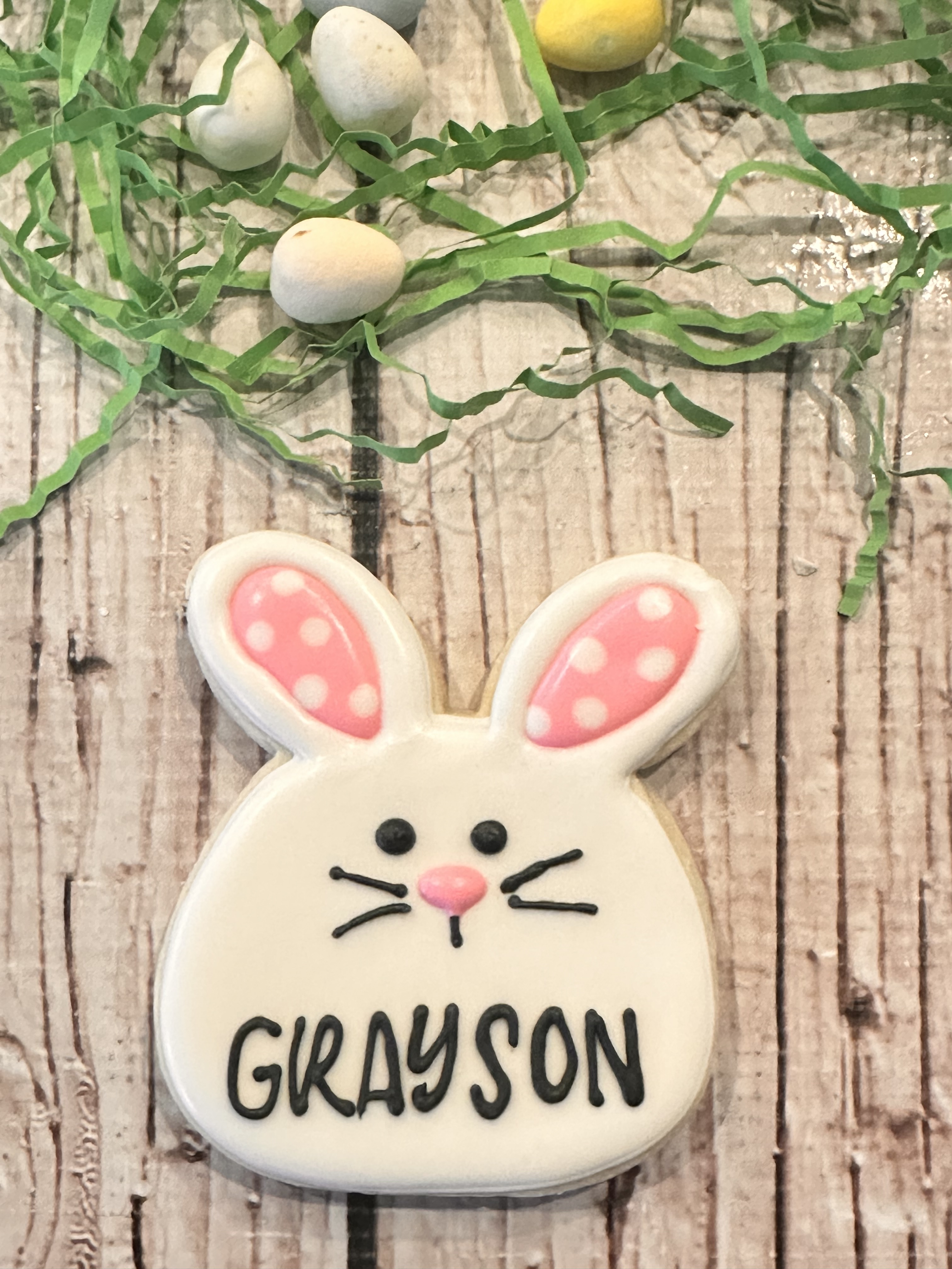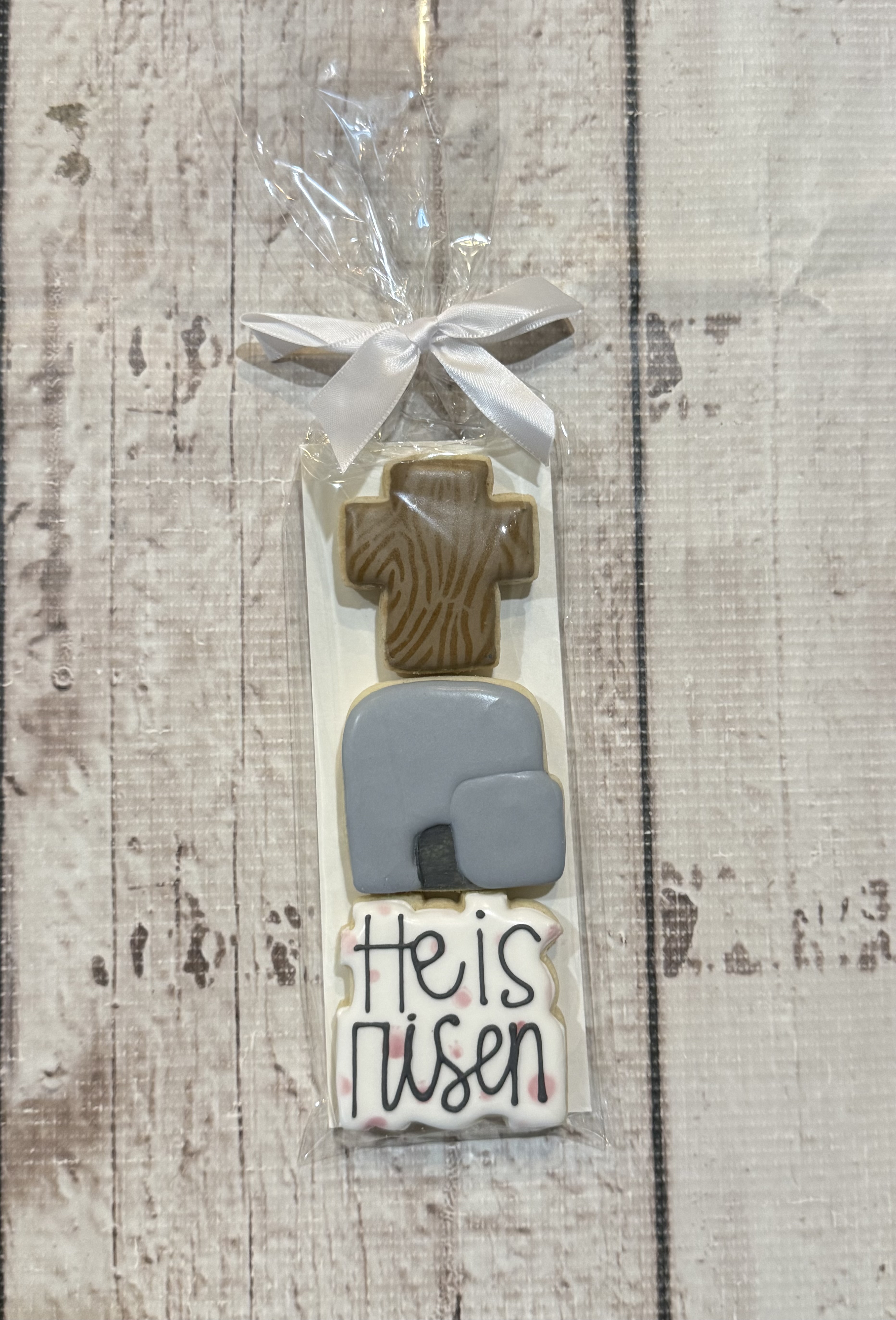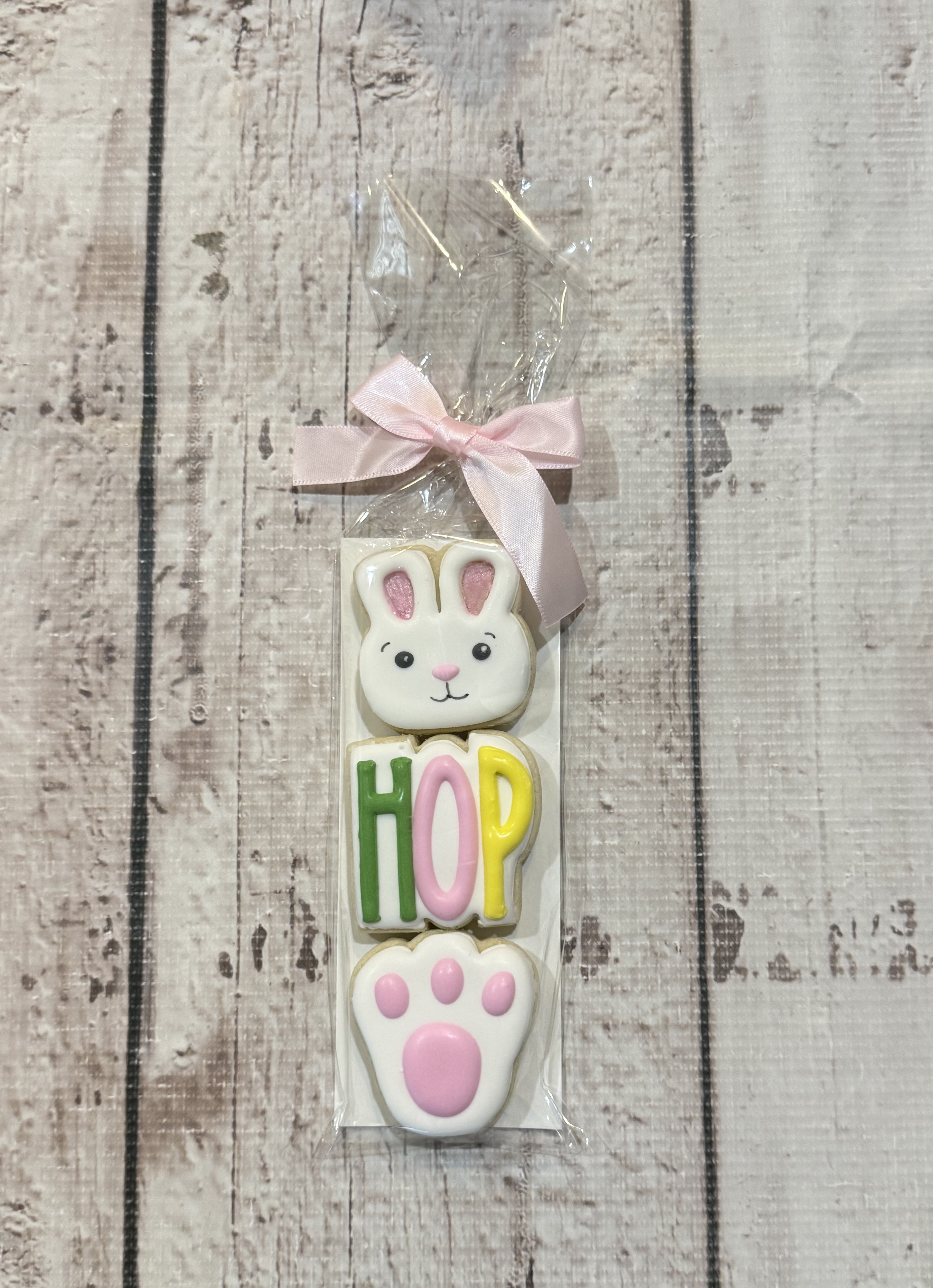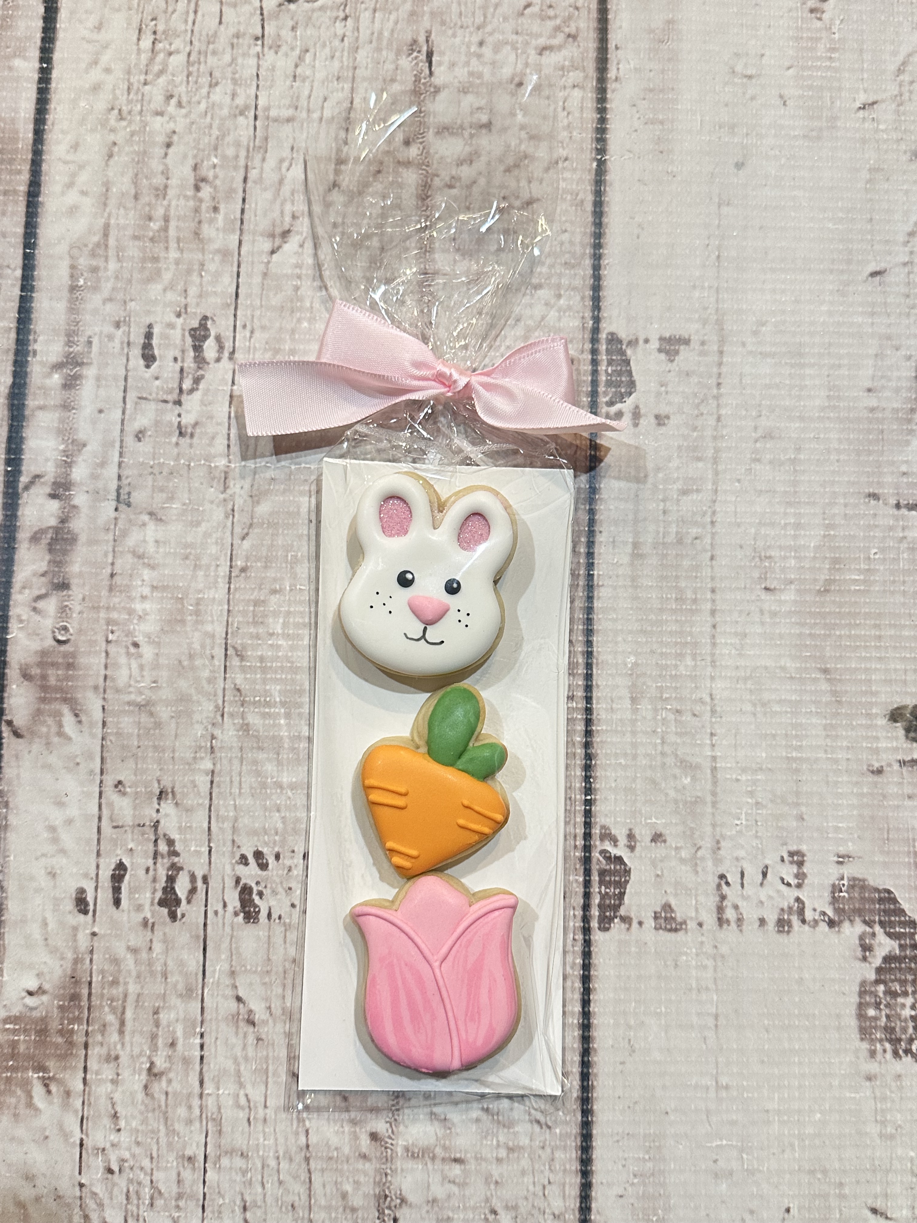 Comes with 3 Easter mini cookies with a grease back card stock wrapped in cello bag with a ribbon.