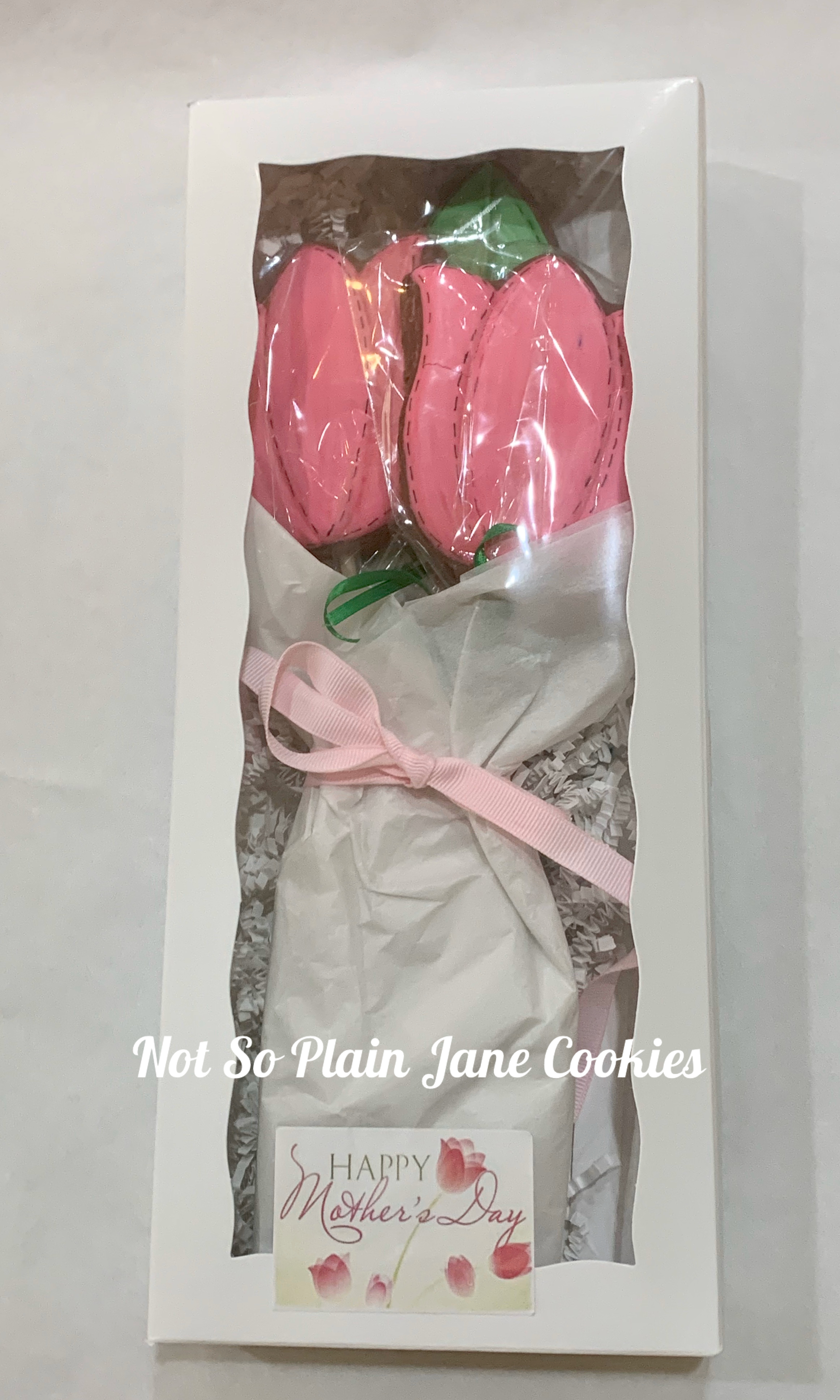 Two tulips and one leaf cookie pop wrapped in parchment paper inside a box.