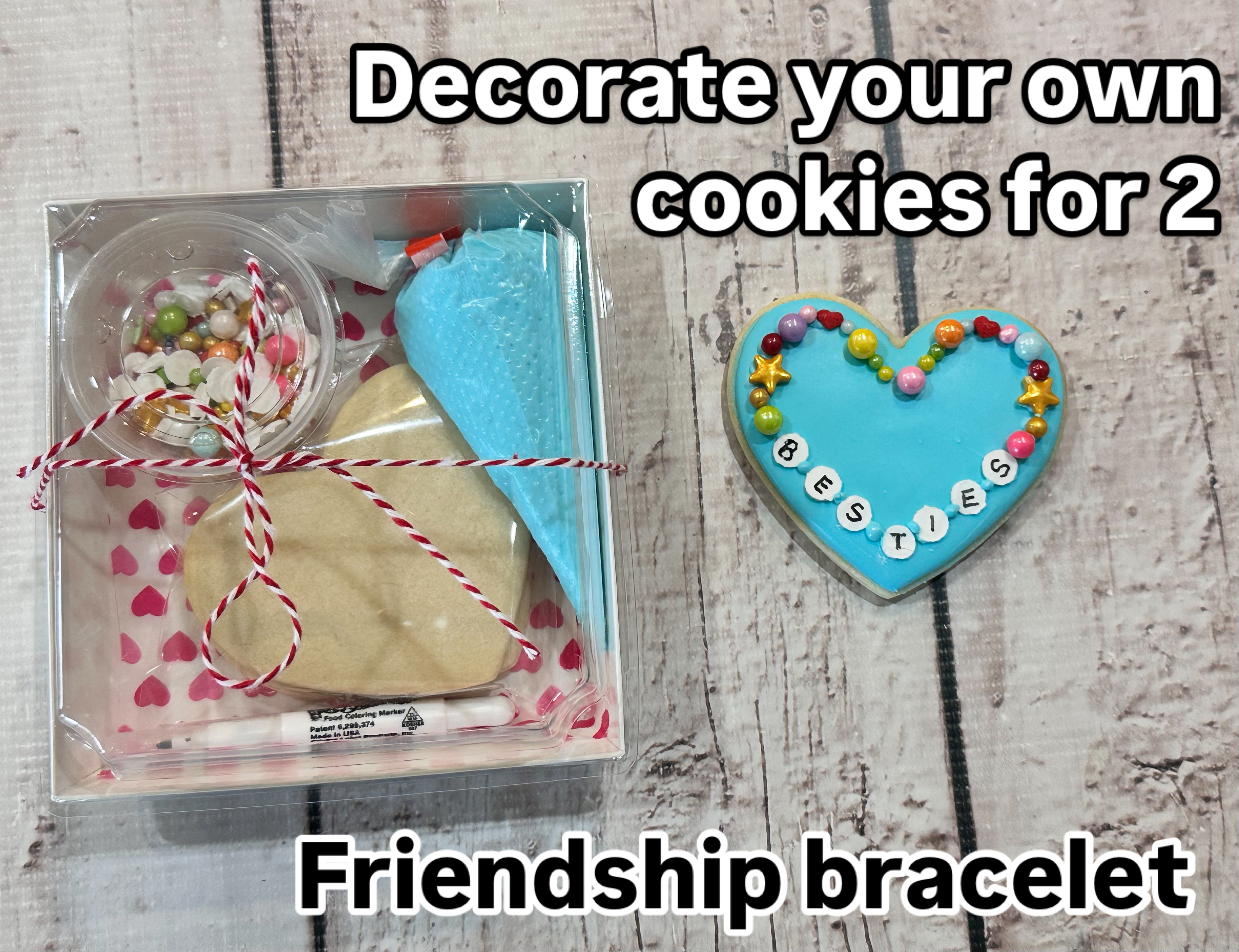 2 un-iced heart shaped cookies, various shape and bead sprinkles, flat white circle royal icing to write letter with the black edible marker (also included) and blue icing. Everything you need to make these friendship bracelet for you and a friend.